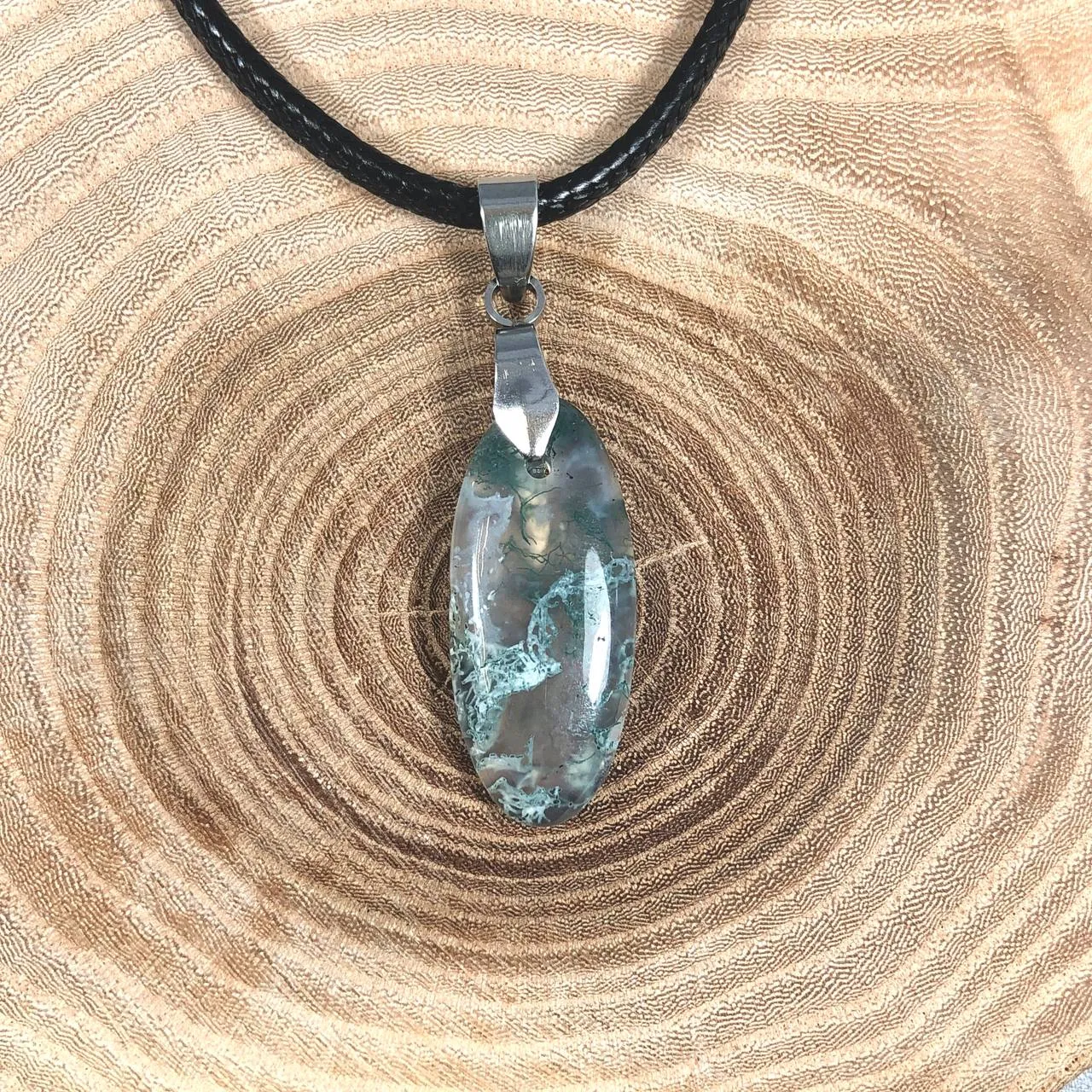 این گردنبند عقیق خزه ای سبز طبیعی ، همراه بند طرح چرمی مناسب سنگ درمانی است.