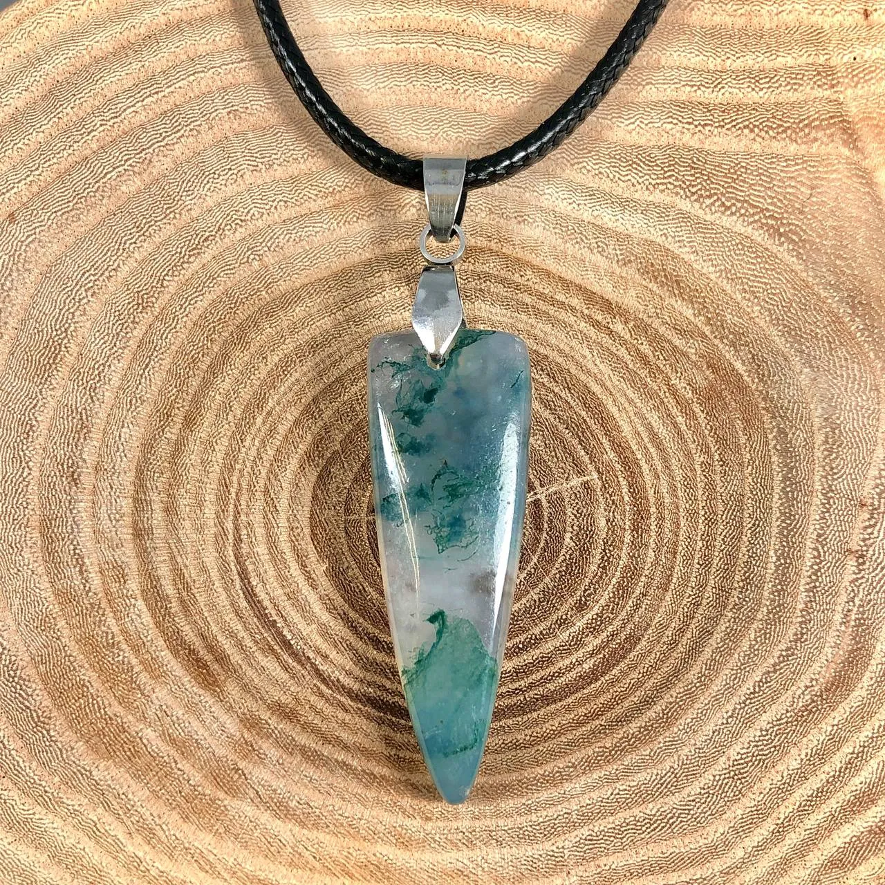 این گردنبند عقیق خزه ای سبز طبیعی ، همراه بند طرح چرمی مناسب سنگ درمانی است.